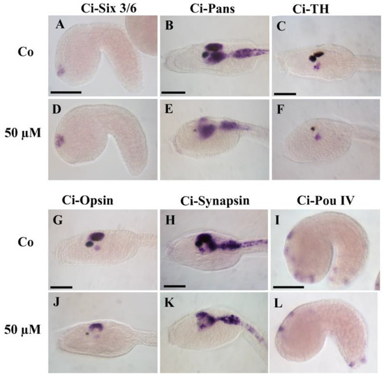 Effects of WAY-100635 on neural differentiation. Expression pattern of neural markers in mid-tailbud embryos (Ci-Six 3/6: (A,D); Ci-Pou IV: (I,L)) and larvae (Ci-Pans: (B,E); Ci-TH: (C,F); Ci-Opsin: (G,J); and Ci-Synapsin: (H,K)) of C. intestinalis. Scale bars: 50 µm.