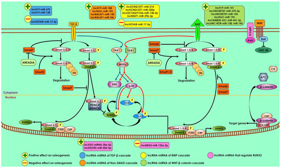 In humans, MSCs osteogenesis is directed by the lncRNAs H19 and linc-ROR. H19 may be unregulated during osteogenic-related gene expression, and in vivo increases bone formation by targeting miR-22 and miR-141, which act as potent inhibitors of osteogenesis. Moreover, miR-22 and miR-141 may downregulate β-catenin expression, attenuating the Wnt/β-catenin signaling for osteoblastic activity [78]. Similarly, linc-ROR may also enhance the expression of osteogenic genes by targeting miR-138 and miR-145 [79]. Furthermore, the lncRNAs MEG3 and AK141205 may promote osteogenesis by dissociating SOX2 from the BMP4 promoter [80]. Osteogenesis of hADSCs downregulates expression of the lncRNA MIAT, whose deficiency encourages osteogenic differentiation in vitro and stimulates bone formation in vivo, indicating that MIAT inhibits osteogenesis whereas MIAT silencing reverses TNF-inhibited osteogenesis [81,82]. Further, osteogenesis of hBMSCs downregulates the expression of the lncRNA DANCR. Deficiency in DANCR expression increases ALP and osteogenic marker gene expression, promoting the cell cycle in the S phase, whereas overexpression of DANCR causes opposite effects [83]. Interestingly, lncRNA MIR31HG downregulation dramatically promotes osteogenesis and significantly reduces the osteogenic differentiation inhibition caused by hADSC inflammation. MIR31HG may also interact with NF-κB to inhibit bone formation. However, MIR31HG and NF-κB form a regulatory loop that improves osteogenesis in hADSCs under an inflammatory microenvironment. Given the importance of MIR31HG, it may be a therapeutic target for inhibiting inflammation and improving bone formation [84]. LncRNA ANCR silencing promotes osteoblast differentiation because it may interact with EZH2 to catalyze H3K27me3 in the runt-related transcription factor-2 (RUNX2) promoter and inhibit RUNX2 expression [85]. Osteogenic differentiation is regulated by lncRNAs such as H19 (lncH19), KCNQ1OT1, nuclear-enriched transcript 1 (NEAT1), metastasis-associated lung adenocarcinoma transcript 1 (MALAT1), lncRNA LINC00707, lncRNA HULC, lncRNA HOTAIR, maternally expressed gene 3 (lncRNA MEG3), XIXT, and DGCR5 in human bone marrow mesenchymal stem cells (hBMSCs) [86,87]. The lncRNA (AK141205) regulates the process of osteogenic differentiation of MSCs by upregulating CXCL13, while ANCR suppresses osteogenesis of periodontal ligament stem cells (PLSC) by sponging miR-758 [26,88,89]. The downregulation of MEG3 promotes osteogenic differentiation of human dental follicle stem cells by regulating the pathway Wnt/β-catenin [90]. The interaction of lncRNA and miRNA in several osteogenic signaling pathways, such as Wnt/β-catenin and TGF-β/BMP-SMAD-dependent and -independent pathways, is shown in Figure 1.