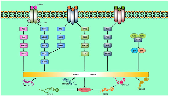 Long non-coding RNA that regulates osteosarcoma invasion and metastasis. MALAT1, SNHG12, HOTAIR, FGFR3-AS1, and HIF2PUT are lncRNAs that govern osteosarcoma invasion and metastasis. The Erk1/2, JNK1/2, P38, PI3K/Akt, and NF-B signaling pathways control MMP-2 and MMP-9 secretion. MMP-2 and MMP-9 govern osteosarcoma cell invasion.