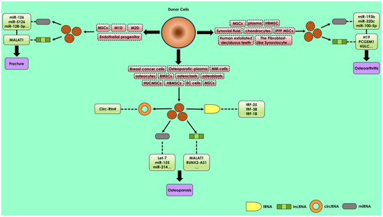 Exosomes exist as membrane-bound extracellular vesicles synthesized inside the eukaryotic cells and act as a trans-regulatory element by transporting proteins. Exosomes contain biologically active molecules like DNA, RNAs (lncRNA, miRNA, circRNA, and tRNA), and some proteins, which are transferred to target cells. Exosomes communicate between the cells through endocytosis, ligand-receptor interactions, direct membrane fusion, or through signaling pathways [98,99]. Exosomes with low molecular weight, small size, stable structure, less toxicity, and other characteristics are employed as “nano-medicine carriers” in tissue regeneration and/or disease treatment [100,101]. Importantly, ncRNAs are present in exosomes that perform diverse functions including bone remodeling and bone-related disease [102]. BMSCs, osteoclasts, osteoblasts, lymphocytes, and macrophages secrete exosomes that regulate bone metabolism [103]. In bone metabolism, osteoblast differentiation is intercepted by exosomes secreted by osteoclasts [104]. However, the solicitation of osteoblast differentiation is regulated by exosomes produced by BMSCs and osteoblasts as well. In bone homeostasis, osteoblasts, osteoclasts, chondrocytes, and other cells secrete exosomal ncRNAs, which are involved in the regulation of bone-related diseases by inhibiting osteoclast differentiation, enhancing chondrocytosis, and promoting angiogenesis. Exosomal miRNAs secreted from MSCs exhibit potential regulatory effects on osteogenesis [102]. In humans, during BMSC osteogenic differentiation, the expression of exosomal miRNAs plays a regulatory role, and a low expression of miR-885-5p serves as a negative regulator by suppressing Wnt5 and RUNX2 [105].