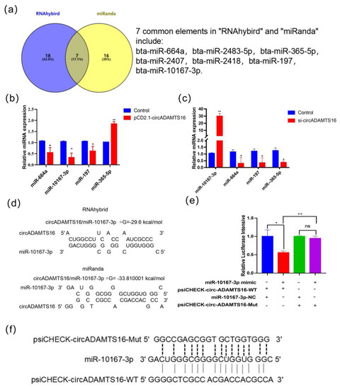 Identification of potential target miRNA of circADAMTS16. (a) RNAhybrid and miRanda predict potential miRNAs. (b,c) The expression of potential miRNAs was detected by qPCR. (d) RNAhybrid and miRanda online software were used to predict the targeted binding site of miR-10167-3p and circADAMTS16. (e) circADAMTS16 and miR-10167-3p wild-type vector binding site and mutant type vector mutation site. (f) Dual luciferase reporting experiment verified the targeting relationship between miR-10167-3p and circADAMTS16. * p < 0.05, ** p < 0.01, ns indicated p > 0.05.