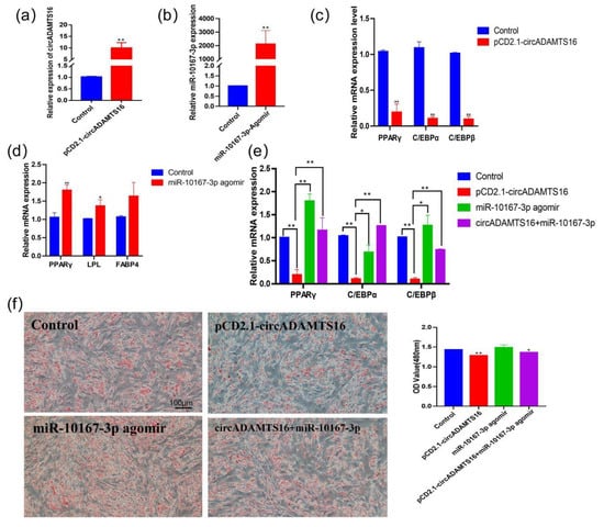 The role of circADAMTS16 in bovine adipocyte differentiation was investigated by performing gain-of-function experiments for bovine preadipocytes. After transfection of pCD2.1-circADAMTS16, the expression of circADAMTS16 was significantly up-regulated (Figure 2a), while the expression of adipogenic marker genes PPARγ, C/EBPα, and C/EBPβ was inhibited (Figure 2b). Then, miR-10167-3p agomir was transfected into bovine preadipocytes to increase the expression of PPARγ, lipoprotein lipase (LPL), and fatty-acid-binding-protein 4 (FABP4) (Figure 2c,d). Meanwhile, circADAMTS16 and miR-10167-3p agomir were co-transfected into bovine adipocytes and qPCR showed that circADAMTS16 reversed the promotion of miR-10167-3p agomir on adipogenesis (Figure 2c). The expression of circADAMTS16 inhibited the accumulation of lipid droplets in bovine adipocytes, while miR-10167-3p agomir promoted the accumulation of lipid droplets (Figure 2e). CircADAMTS16 may bind to miR-10167-3p as competitive endogenous RNA.