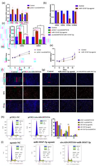 We explored whether circADAMTS16 affects cell proliferation ability by targeting miR-10167-3p. Firstly, amplification of circADAMTS16 up-regulated the expression of two proliferation markers: cyclin-dependent-kinase 2 (CDK2) and cyclin-dependent-kinase 4 (CDK4) (Figure 3a,b). Furthermore, the opposite results were obtained in the loss-of-function experiment. The expression of CDK2 and CDK4 was down-regulated by interfering with circADAMTS16, while the expression of CDK2, CDK4, proliferating cell nuclear antigen (PCNA), and cyclin D2 (CCND2) was up-regulated by interfering with miR-10167-3p (Figure S1a,b). Following co-transfection of circADAMTS16 and miR-10167-3p agomir, it was found that circADAMTS16 alleviated the inhibitory effect of miR-10167-3p agomir on cell proliferation (Figure 3c). Cells transfected with pCD2.1-circADAMTS16 showed significantly higher cell viability at 12–48 h than control cells, while the cell viability was inhibited after transfection with miR-10167-3p agomir (Figure 3d,e). Similarly, cell viability was inhibited after transfection of si-circADAMTS16, whereas it was enhanced after transfection of miR-10167-3p antagomir (Figure S1c,d). Meanwhile, EdU experiments further verified that circADAMTS16 targeted miR-10167-3p to promote the proliferation of bovine adipocytes (Figure 3f,g). Furthermore, cell cycle analysis showed that circADAMTS16 promoted the transformation of bovine adipocytes from G0/G1 phase to S phase (Figure 3h), while miR-10167-3p inhibited the transformation of bovine adipocytes from G0/G1 phase to S phase (Figure 3i). Loss-of -function experiments also yielded the opposite results. After transfection of miR-10167-3p antagomir, EdU, and flow cytometry detection of cell proliferation showed that inhibition of miR-10167-3p promoted adipocyte proliferation (Figure S1e–h). Taken together, the above results indicate that circADAMTS16 can promote adipocyte proliferation by targeting miR-10167-3p.