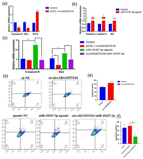 Similarly, we also explored whether circADAMTS16 can affect apoptosis by targeting miR-10167-3p. Overexpression of circADAMTS16 inhibited Caspase-9- and Bcl-2-associated X protein (Bax) expression and promoted the expression of Bcl-2, whereas transfection of miR-10167-3p agomir into bovine adipocytes up-regulated the expression of Caspase-3, Caspase-9, and Bax (Figure 4a,b). After interference with circADAMTS16 and miR-10167-3p, their expression levels were opposite (Figure S2a,b). However, when circADAMTS16 and miR-10167-3p agomir were co-transfected into bovine adipocytes, it was found that circADAMTS16 alleviated the up-regulated expression of Caspase-9 and Bax by miR-10167-3p (Figure 4c). The flow cytometry results indicated that interference with circADAMTS16 and forced expression of miR-10167-3p both promoted apoptosis (Figure 4d), overexpression of circADAMTS16, and interference with miR-10167-3p inhibited apoptosis (Figure S2c–f). However, apoptosis was effectively alleviated by forced expression of circADAMTS16 and miR-10167-3p (Figure 4d–f).