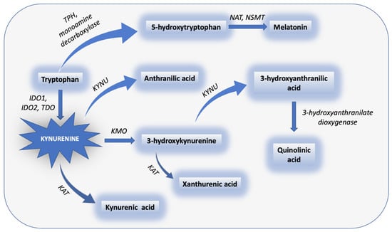 The kynurenine and serotonin pathway. Abbreviations: IDO1, indoleamine 2,3-dioxygenase 1; IDO2, indoleamine 2,3-dioxygenase 2; TDO, tryptophan 2,3-dioxygenase; KAT, kynurenine aminotransferase; KMO, kynurenine 3-monooxygenase; KYNU, kynureninase; TPH, tryptophan hydroxylase; NAT, N-acetyltransferase; NSMT, N-acetylserotonin O-methyltransferase.