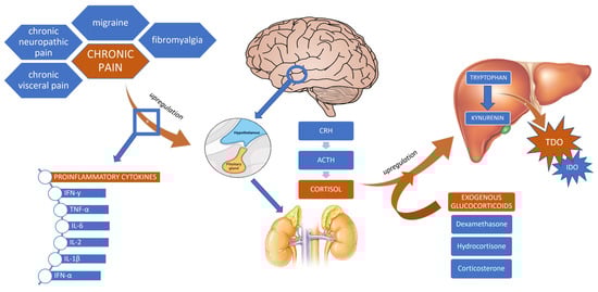Following the suggestion that nervous, immune, and endocrine systems function interdependently [,,], we analyze chronic pain in light of interactions among the 3 overlapping systems. Since pro-inflammatory cytokines have been linked to changes in the hormonal milieu of patients experiencing chronic pain, we concentrate on the effects that pro-inflammatory cytokines exert on the hypothalamic–pituitary–adrenal (HPA) axis. The relevance of this axis lies in that it poses a major mechanism of the stress response: to counter inflammation, the HPA axis secretes a type of steroid hormones called glucocorticoids. Cortisol—produced by the adrenal gland—is the most abundant endogenous glucocorticoid in humans [,]. The purpose of this review is to explore the interactions and importance between glucocorticoid hormones, on the one hand, and metabolites and enzymes of the KP, on the other, in different chronic pain pathologies.