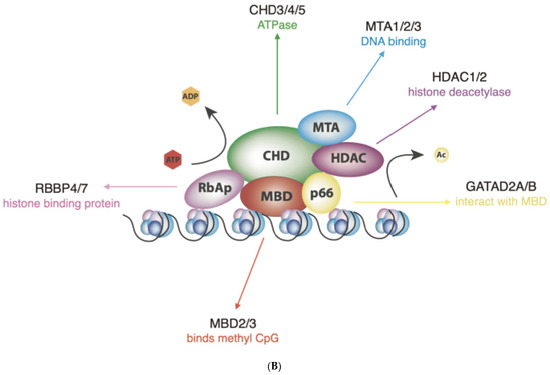 - Reid, X.J.; Low, J.K.K.; Mackay, J.P. A NuRD for all seasons. Trends Biochem. Sci. 2023, 48, 11–25. [Google Scholar] [CrossRef] [PubMed]