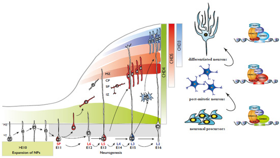 Once neuronal progenitors have exited the cell cycle, they start migrating radially toward the surface of the nascent cortex to populate the various cortical layers (Figure 2). Cortical migration is a unique process in that the first wave of neurons generated populate the deeper cortical layers, whereas neurons generated at later times must travel through the inner layers to reach the surface of the cortex [26,29] (Figure 2). CHD paralog switching is a powerful regulator of neuronal differentiation and radial migration. CHD3, CHD4 and CHD5 play distinct roles during mouse cortical development [14]. Our laboratory showed that the three paralogs display a distinct pattern of expression during mouse cortical development, with CHD4 expression much higher during the early stages of development and declining at later times [14]. Conversely, CHD3 and CHD5 are detected at relatively low levels at embryonic day E12.5, later becoming the prevalent paralogs as cortical development proceeds. Deletion of CHD4 reduces NPC proliferation, resulting in defects of cortical lamination and microcephaly. Interestingly, it specifically affects intermediate progenitor cells (IPCs), a class of basal progenitors that in mice are important neurogenic cells and may be responsible for the evolutionarily driven expansion of the mammalian cortex. Conversely, CHD3 and CHD5, although concomitantly expressed in the developing cortex, differentially regulate layer specification. Neuronal differentiation, migration and laminar specification are highly coordinated and co-regulated processes. Loss of CHD5 induced a delay of early neural migration with many neurons forming an ectopic layer and never reaching the outer layer of the cortex. In contrast, CHD3 controls late radial migration and layer specification. Thus, despite overlapping expression patterns, CHD3 and CHD5 have very distinct roles during cortical development [14]. Importantly, CHD3, CHD4 and CHD5 have mostly non-redundant functions in the brain given that the cortical abnormalities observed in the absence of any of them cannot be rescued by the overexpression of alternative paralogs (Figure 3).