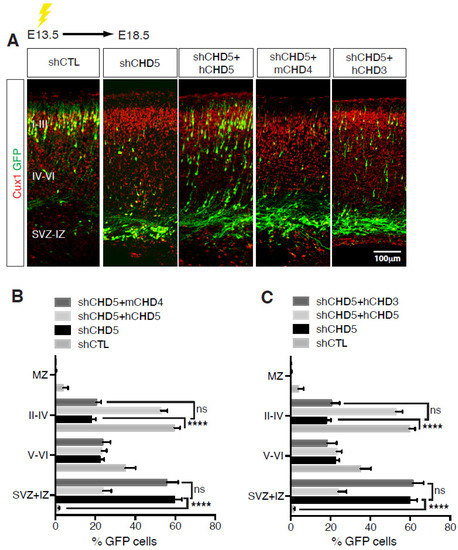 Non-redundant functions of CHDs during cortical development. (A,D) E13.5 embryos were electroporated with the indicated vectors and immunolabelled with GFP (green) and Cux1 (red) antibodies at E18.5. Scale bar, 100 μm. (B,C,E,F) Distribution of cells electroporated with the indicated vectors at E13.5 and analysed at E18.5. 8–13 embryos were analysed per condition; n = 3. All data are presented as mean ± SEM. ** p < 0.01, and **** p < 0.0001 (ns, not significant) by two-way ANOVA with Tukey’s multiple comparisons test. Data published in [14].