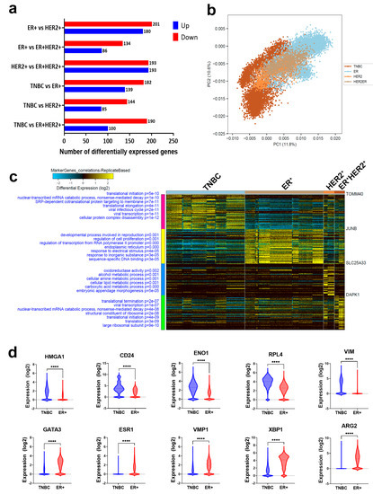 Identification of gene biomarkers enriched in each BC molecular subtype. (a) Bar chart depicting the number of differentially expressed genes (DEGs) in ER+ vs. HER2+, ER+ vs. ER+HER2+, HER2+ vs. ER+HER2+, TNBC vs. ER+, TNBC vs. HER2+, and TNBC vs. ER+HER2+. (b) PCA illustrating the segregation of each BC molecular subtype based on the identified gene markers. (c) Heatmap depicting the enriched gene markers associated with TNBC, ER+, HER2+, and ER+HER2+ employing the MarkerFinder algorithm. The text on the left of each heatmap indicates enriched Go functional categories in each BC subtype and the corresponding enrichment p values. (d) Expression of selected genes enriched in TNBC (upper panel) or ER+ (lower panel) based on RNA–Seq data. **** p < 0.00005.
