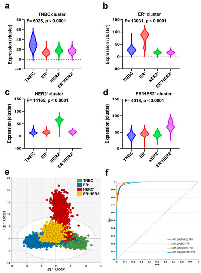 Discriminative analysis based on the identified gene markers. Anova analysis for the identified gene markers enriched in TNBC (a), ER+ (b), HER2+ (c), and ER+HER2+ (d). Sum score from the identified gene markers for each BC subtype were used for Anova analysis. (e) OPLS-DA score plot for the different BC molecular subtypes based on the identified gene markers. (f) ROC analysis of the identified gene markers comparing the four BC molecular subtypes.