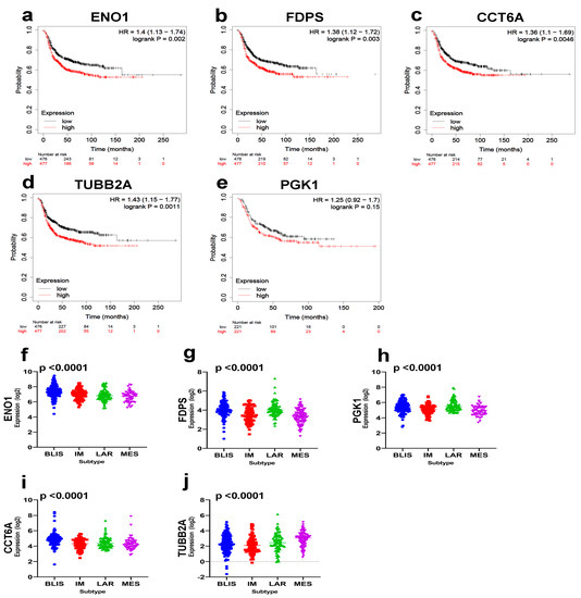 Interestingly, we observed the highest expression of ENO1 in the aggressive BLIS TNBC subtype, while highest expression of FDPS, PGK1, and CCTA6 was observed in the BLIS and LAR TNBC subtypes (Figure 5f–j). Taken together, our data have highlighted ENO1, FDPS, CCT6A, TUBB2A, and PGK1 as poor prognostic biomarker and potential therapeutic targets for TNBC.
