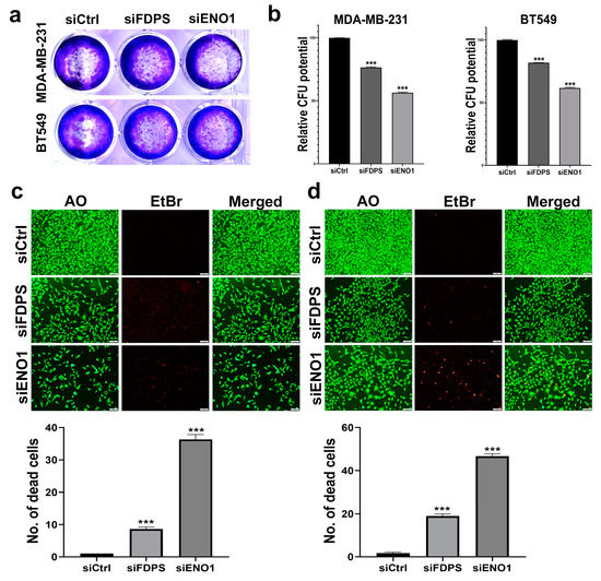 Quantitative analysis of the CFU potential relative to control cells revealed a significant suppression of the colony formation potential of MDA-MB-231 and BT-549, which was more remarkable for ENO1 (56% and 61% CFU, respectively), followed by FDPS (76 and 81% CFU, respectively) (Figure 6b). AO/EtBr staining coupled with fluorescent microscopy revealed the suppression of MDA-MB-231 and BT-549 cell growth and enhanced toxicity in response to ENO1 and FDPS depletion (Figure 6c,d). The quantification of the number of dead (red) cells under each treatment condition is shown in the lower panels, which is concordant with the CFU data.