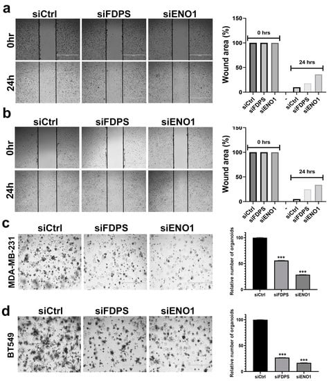 We subsequently assessed the effects of ENO1 and FDPS suppression on the ability of TNBC to migrate and to form colonies under a 3D organotypic culture. Suppression of ENO1, and to a lesser extent FDPS, reduced the migration potential of the MDA-MB-231 and BT-549 cells models (Figure 7a,b). The quantification of the wound area at 24 h, relative to 0 hrs, is shown in the right panels. Concordantly, the suppression of ENO1 and FDPS also inhibited the organotypic growth of TNBC models, thereby corroborating the catastrophic effects of targeting ENO1 and FDPS in TNBC. In agreement with previous data, ENO1 inhibition exhibited more profound effects on organoid formation (Figure 7c,d, right panels).