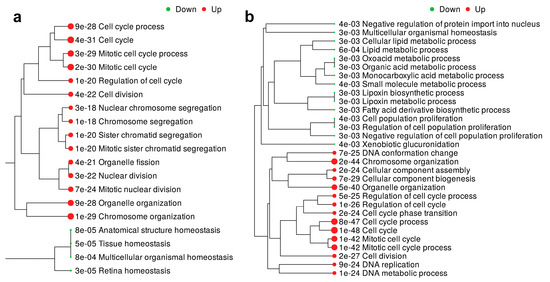 To gain better understanding of the potential roles of ENO1 and FDPS in TNBC, a cohort of 360 TNBC patients was divided into high and low, according to the median ENO1 or FDPS expression. Differential expression and GO enrichment analyses revealed a significant association of the elevated ENO1 expression with the biological process associated with the cell cycle, cell division, and organelle organization (Figure 8a and Table S10). Interestingly, GO analysis revealed significant enrichment in several other functional categories in ENO1high, including the glycolysis and ATP metabolic processes (Figures S8 and S9). Elevated FDPS expression was associated with the cell cycle, mitosis, organelle organization, and other processes (Figure 8b and Table S11). Those data are in line with our CFU data implicating ENO1 and FDPS in promoting cell proliferation.