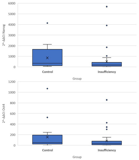 Box plots of 2−ΔΔCT values of the Nanog and Oct-4 genes.