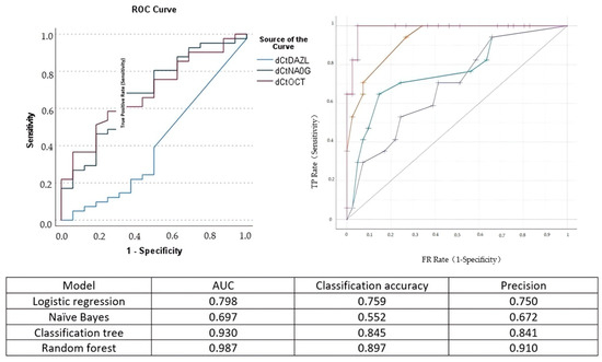 Left side: receiver operating characteristics (ROC) curve for the prediction of cervical insufficiency of DAZL (blue line), Nanog (green line), and OCT-4 (purple line). Right side: ROC analysis of the performance of logistic regression (green curve), naïve Bayes (blue line), classification and regression tree (yellow line), and random forest (purple line) analysis. The model area under the curve (AUC), classification accuracy, and precision are presented in the accompanying Table.