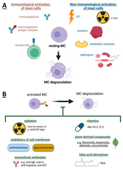 Mast cell degranulation can be stimulated by non-immunological and immunological factors (A), but this process can be also inhibited by various groups of compounds and factors (B). Figure created with BioRender.com.