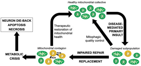 Taken together, the central importance of mitochondria for neuronal signaling and repair, the dual effects of mitochondria as the source of ATP that drives essential biological processes and of ROS that damages cellular components, and the prevalence of mitochondrial abnormalities in etiologically diverse neurological diseases, suggest that mitochondrial pathology can significantly contribute to neurodegeneration as a secondary consequence of multiple different primary pathophysiological lesions. An attractive hypothesis that may explain why mitochondrial involvement in neurodegeneration is so prevalent considers that the primary underlying causal factor, be it a misfolded or aggregated protein, increased ROS or some other cellular stress, damages the neuronal mitochondrial collective. The possible role played by ROS in ALS has received a great deal of attention, and the challenges and opportunities of therapeutically targeting ROS have recently been comprehensively reviewed []. Related to the current topic of mitochondrial dysdynamism, it is posited that damaged individual mitochondria can accumulate to such a degree that normal compensatory mechanisms, such as reparative mitochondrial fusion and mitochondrial removal by mitophagy, are overwhelmed. Indeed, both of these processes are reportedly impaired in ALS and other neurodegenerative conditions [,]. This situation can initiate a “mitochondrial contagion” [], wherein a subpopulation of damaged mitochondria collaterally injures their healthy counterparts by elaborating ROS that oxidatively damages respiratory enzymes, organelle membranes, mtDNA and mRNA [,,,]. This creates a feed-forward cycle of mitochondrial degeneration in ALS [] that can either trigger a mitochondrial release of cytochrome c to activate caspase-mediated apoptosis [], or evoke mitochondrial depolarization sufficient for transitioning of the mitochondrial permeability pore to induce non-apoptotic mitochondria-mediated programmed cell death [,]. In either scenario, primary mitochondrial damage evokes secondary mitochondrial damage that causes neuronal drop-out (Figure 1). While there are abundant data indicating that the above individual events occur in ALS, it remains unclear whether mitochondrial abnormalities in non-mitochondrial neurological disorders are simply a consequence of the primary underlying neuronal pathology that contribute little to disease progression, or if they can become a substantial contributory factor. Quantifying the impact of secondary and tertiary mitochondrial injury on disease progression cannot be satisfactorily addressed in studies of cultured cells or isolated organelles. Rather, it requires mitochondria-targeted therapeutic interventions performed using in vivo animal models of the subject human diseases, as reviewed below.
