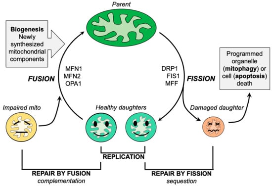 Mitochondrial fission, the division of a single parent mitochondrion into two daughter organelles, is the process by which normal mitochondria replicate and abnormal mitochondria rid themselves of damaged components. Replicative fission is symmetric, producing equally sized and normally functioning daughter organelles that mature and grow both by fusing with other normal mitochondria (or, in cell types having interconnected mitochondria, with the network) and by incorporating newly generated nuclear- and mtDNA-encoded constituent proteins. The combination of replicative fission and the incorporation of newly synthesized biological components is termed mitochondrial biogenesis []. In contrast, asymmetric mitochondrial fission of non-lethally damaged mitochondria is a reparative process that directs the most severely damaged components into the smaller of two different-sized daughter organelles. The concentration and sequestration of dysfunctional elements within one daughter mitochondrion causes it to depolarize, triggering its selective mitophagic elimination in part via the PINK-Parkin pathway []. The remaining daughter mitochondrion, into which the healthy components were directed, re-joins the mitochondrial collective through fusion or biogenesis, as described for the healthy daughters of a replicative fusion event (Figure 2). Thus, mitochondrial fission is essential both for mitochondrial quantity control via replication and mitochondrial quality control via mitophagy. The major factors and events that mediate mitochondrial fission have been identified and are described in detail elsewhere [,]. Briefly, cytosolic DRP1 is recruited to mitochondria where it oligomerizes in a chain of pearls structure that circumscribes the mitochondrion and contracts, essentially garroting the organelle in two []. Cytosolic DRP1 may bind to mitochondrial Fis1 [,]. However, there appear to be Fis1-independent mechanisms for mitochondrial fission, i.e., other mitochondrial DRP1 receptors such as mitochondrial fission factor (MFF) [,]. The Fis1-DRP1 interaction has been posited to have specific relevance to pathological or stress-induced mitochondrial fission [], whereas Mff-DRP1 interactions may mediate physiological/replicative fission []. Alternately, Fis1 may contribute to mitochondrial fragmentation by suppressing MFN and OPA1-mediated mitochondrial fusion [].