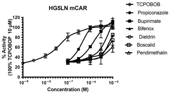 More than 80 pesticides were screened for their ability to activate mCAR. The pesticides were first tested for the non-specific modulation of luciferase expression in the HG5LN parental cell line, which contains the same reporter gene as HG5LN-GAL4-mCAR cells but lacks Gal4-mCAR. Then, the chemicals were tested in HG5LN GAL4-mCAR at concentrations (100 nM to 10 μM) that were not able to inhibit or activate luciferase expression in the HG5LN reporter cell line. The activity of the chemicals in mCAR was compared to the activity of the reference mCAR agonist TCPOBOP. This compound fully activated mCAR, with an EC50 of 40 nM (Figure 1).