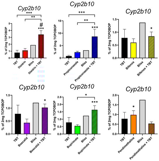 Gene expression levels of the CAR prototypical target gene, Cyp2b10, in the livers of mice according to RT-qPCR. The results are presented as a graph showing the expression levels in % of the 2 mg TCPOBOP (100%) and DMSO groups (0%). The data are presented as mean ± standard error of the means. The statistical analysis used a one-way ANOVA test followed by Tukey’s multiple comparisons test to determine the difference between the pesticide-treated mice and DMSO-treated mice. The p-values indicate the level of significance, with * p < 0.05, ** p < 0.01, and *** p < 0.001 indicating significant differences. Additionally, the study also used a one-sample t-test to determine the difference between the observed effect of TBT + pesticide and the calculated Bliss additivity of TBT + pesticide, represented by # p < 0.05.