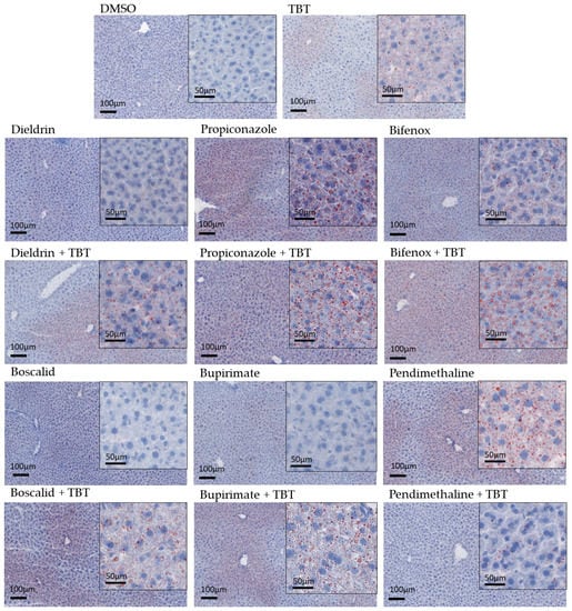 Histological sections of the liver were stained with red oil to test for lipid accumulation (Figure 3). Steatosis was morphologically explored using a well-established scoring system [] (Table 3). The control (DMSO) did not show any lipid accumulation. Significant steatosis (lipid accumulation) was observed in at least one individual subjected to treatments containing pesticides, excluding bupirimate, and boscalid. Pendimethalin and the combination of TBT with dieldrin, propiconazole, bifenox, boscalid, and bupirimate led to a mean area of lipid droplets greater than 5%, which suggests steatogenic potential for these molecules. All observed steatoses were microvesicular. In some cases, more serious steatosis was observed, characterized by an azonal distribution of lipid droplets, especially in the propiconazole + TBT group. A significant combined effect on lipid droplet area was observed for TBT combined with propiconazole, bifenox, and bupirimate, while the combination of TBT with pendimethalin led to the disappearance of steatosis observed with pendimethalin alone.