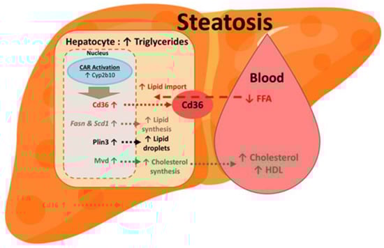 The development of steatosis, or fatty liver, can occur through various mechanisms, such as an increase in lipid synthesis, a decrease in lipid catabolism, enhanced lipid uptake or a reduction in lipid export []. Analyses of genes related to these metabolic pathways using RT-qPCR have provided insights into the mechanisms of lipid accumulation induced by the combination of TBT with pesticides. The results of this analysis show that exposure to propiconazole, bifenox and pendimethalin can lead to an increase in the expression of lipogenic genes, indicating a possible role of this pathway in the formation of steatosis. Bifenox induces lipid catabolism through the up-regulation of Eci and Acox1, as well as lipid uptake through up-regulation of the CD36 transporter. In this case, steatosis likely results from the overwhelmed liver’s ability to catabolize fatty acids through an increase in their uptake. This theory is supported by the observation of a decrease in free fatty acids in the blood of mice exposed to a mixture of bifenox and TBT (Table 5), which suggests that these fatty acids are taken up by the liver through the CD36 transporter (Figure 5). These results are in agreement with previous studies in which a steatogenic effect of pesticides occurs via similar or different mechanisms [,].