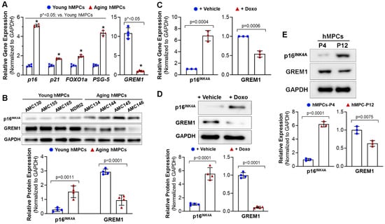 Decreased expression of GREM1 is associated with the aging/senescence of cardiac mesenchymal progenitor cells (hMPCs). (A) Gene expression of cell senescent markers (p16, p21, FOXO1a, and PSG5, as well as GREM1) in four lines of pediatric and aging hMPCs. (B) Western blot analysis for the protein expression of p16INK4A and GREM1 in four lines of pediatric and aging hMPCs. (C) Gene expression of p16INK4A and GREM1 in the pediatric hMPCs with 12 h doxorubicin-induced cell senescence. (D) Western blot analysis for the protein expression of p16INK4A and GREM1 in the pediatric hMPCs with 12 h doxorubicin-induced cell senescence. (E) Western blot analysis for the protein expression of p16INK4A and GREM1 in the pediatric hMPCs with different passage number following replicative senescence. Data are mean ± SEM. p value was calculated by unpaired Student’s t-test, n ≥ 3 independent experiments. * indicated the significant difference compared to the control group.