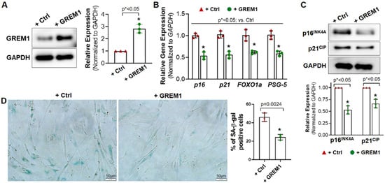 Previous studies have indicated that GREM1 is associated with cell survival and proliferation; however, no study to date has assessed GREM1’s role in cell aging and senescence. To determine the effect of cell aging on GREM1 expression, real time quantitative polymerase chain reaction (RT-qPCR) was conducted for the RNA samples isolated from the four lines of pediatric hMPCs and four lines of adult/aging hMPCs. As shown in Figure 1A (left panel), adult/aging hMPCs exhibited greater gene expression of senescence and quiescence markers, such as p16, p21, FOXO1a, and NANOG, compared to pediatric hMPCs. Meanwhile, the gene expression of GREM1 was significantly lower in aging hMPCs than in pediatric hMPCs (Figure 1A, right panel).