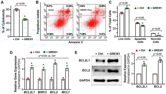 A previous study showed that GREM1-overexpressing MSCs reduced the amount of apoptosis induced by oxidative injury []. To assess the effect of GREM1 overexpression on cell viability, hMPCs were incubated with 2 mM H2O2 for 3 h. Cytotoxicity was evaluated using an LDH release assay. There was a 30% decrease in cytotoxicity evident upon overexpression of GREM1 (Figure 3A).