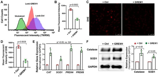 Additionally, fluorescent microscope imaging was conducted for cultured hMPCs following the staining with dihydroethidium (DHE), a fluorescence indicator for superoxide. An increase in the fluorescence intensity for DHE indicates an increase in oxidation. Overexpression of GREM1 significantly reduced the fluorescent intensity of DHE (Figure 4C,D), suggesting that there is a decrease in ROS in hMPCs upon overexpressing GREM1. Taken together, these results indicate that overexpressing GREM1 can reduce oxidative stress. Accumulation of ROS is one of the hallmarks of aging, and GREM1-induced reduction in ROS is promising for the rejuvenation of aging hMPCs.