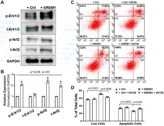 To further investigate the mechanism behind GREM1-mediated hMPCs’ rejuvenation, we examined the effect of ERK inhibition on oxidative stress-induced apoptosis with FACS analysis following annexin V/PI staining. Since GREM1 overexpression led to upregulation of the ERK/NRF2 signal pathway (Figure 5A), we hypothesized that inhibition of ERK would lead to a reversal in GREM1-mediated rejuvenation, in terms of cell survival and apoptosis. ERK was inhibited through the treatment of hMPCs with 10 µM U0126 for 24 h []. Treatment of GREM1-overexpressing hMPCs with the ERK inhibitor U0126 led to a significant decrease in the number of live cells in comparison to cells that overexpressed GREM but were not treated with U0126. There was also a significant increase in cell apoptosis in GREM1-overexpressing hMPCs that were treated with U0126 (Figure 5C,D). Furthermore, after the addition of the inhibitor, there was no longer a statistically significant difference in survival or apoptosis between vector and GREM1 groups such as the one found earlier without the inhibitor (Figure 5C). This data suggests that an ERK-dependent pathway plays a critical role in GREM1-mediated hMPC survival.