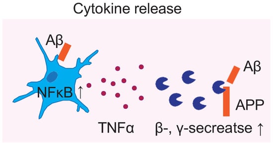 Aβ causes microglia to secrete pro-inflammatory cytokines and neurotoxic substances, including tumor necrosis factor-α (TNF-α), IL-1, IL-6, IFN-γ, and reactive oxygen species []. First, TNF-α is one of the most important pro-inflammatory cytokines in AD []. An in vitro study has shown that Aβ directly stimulates TNF-α production in microglia by activating the transcription factor NF-κB []. TNF-α increases the expression of β- and γ-secretases which generate Aβ from APP in vitro [,]. In healthy adults, the levels of TNF-α in the cerebrospinal fluid or blood and CNS are very low, but they are significantly elevated in the blood and CNS of patients with AD [,]. It has been reported that the risk of AD is lower in patients with rheumatoid arthritis and psoriasis who have been treated with TNF-α blocking agents []. IL-1 is also a key factor in AD because this factor leads astrocytes to release α1-antichymotrypsin (ACT) which promotes Aβ deposition []. IL-1β regulates the synthesis of APP, secretion of APP from glial cells, and amyloidogenic processing of APP in in vitro experiments []. Other microglial inflammatory mediators also contribute to the progression of AD. For example, overexpression of IL-6 induces neuroinflammation and impairs learning and memory functions []. In addition, IFN-γ induces lasting microglial priming which includes proliferation and moderate nitric oxide release, resulting in impairment of cognitive function []. As discussed above, Aβ and microglia interact with each other to accelerate inflammatory responses and neural damage, leading to the persistent development of AD.