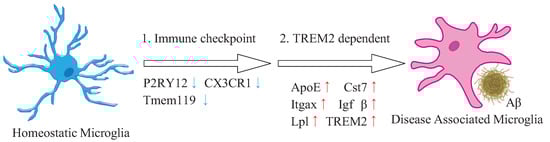 A detailed classification of microglia may help in detecting new therapeutic targets. Since the 2010s, microglia have been categorized as “M1” (pro-inflammatory) and “M2” (anti-inflammatory) based on the concept established in macrophages []. However, in recent years, researchers have recommended using more nuanced tools (for example, proteomic, metabolomic, transcriptomic, morphological, and epigenetic tools) to investigate microglial functions because microglia have more complex responses than simply polarized responses, such as M1 and M2 []. The technologies that have been the basis for the research field of microglia by revealing heterogeneous cell states are scRNA-seq and snRNA-seq [,]. In 2017, scRNA-seq identified a group of microglia, called DAM, found around Aβ plaques which is a key microglial phenotype in AD []. DAMs upregulate genes, including ApoE, Trem2, Itgax (encoding integrin alpha X), Igf1 (encoding insulin-like growth factor-l), Lpl (encoding lipoprotein lipase), and Cst7 (encoding cystatin 7) []. DAMs are activated sequentially in two steps as TREM2-independent and -dependent pathways (Figure 3) []. The first step involves TREM2-independent downregulation of homeostatic markers, such as P2ry12, Cx3cr1, and Tmem119. The second activation state is TREM2-dependent. It is associated with the overexpression of genes involved in lipid metabolism and phagocytosis. DAM-like cells have also been observed in other animal models of diseases, such as amyotrophic lateral sclerosis and multiple sclerosis []. In addition, a recent study characterized a human AD microglia (HAMs) profile from the postmortem brain []. HAMs had profiles similar to those of DAM genes related to lipid transport and lysosomal biology, such as ApoE. However, it has also been reported that genes that are unchanged or not expressed in DAMs are upregulated in HAMs []. Therefore, the differences between human and animal models should be examined in more detail.