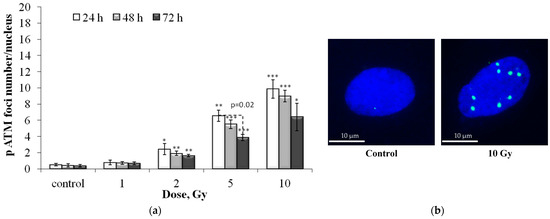 (a) Dose-dependent changes in the number of residual pATM foci in human fibroblasts 24 h, 48 h and 72 h after irradiation. Data are means ± SE of three independent experiments. * p < 0.05, ** p < 0.01 and *** p < 0.001—compared with the corresponding time of control; (b) Representative microphotographs of immunocytochemically stained control and 10 Gy irradiated cells (24 h) showing nucleus (blue) and foci (green).