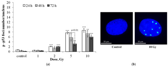 (a) Dose-dependent changes in the number of residual p-p53 foci in human fibroblasts 24 h, 48 h and 72 h after irradiation. Data are means ± SE of three independent experiments. * p < 0.05, ** p < 0.01 and *** p < 0.001—compared with the corresponding time of control; (b) Representative microphotographs of immunocytochemically stained control and 10 Gy irradiated cells (24 h) showing nucleus (blue) and foci (green).