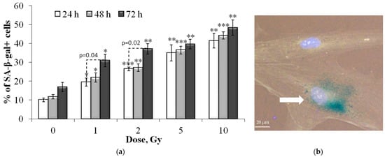 (a) Dose-dependent changes in the senescent cell (SA-β-gal+) proportion in human fibroblasts 24 h, 48 h and 72 h after irradiation. Data are means ± SE of three independent experiments. * p < 0.05, ** p < 0.01 and *** p < 0.001—compared with the corresponding time of control; (b) Representative image of the SA-β-gal positive cell (marked with arrow—cytoplasm colored in dark green-blue). Nuclei are counterstained with Hoechst 33342 (light blue).