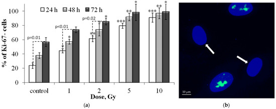 (a) Dose-dependent changes in the Ki-67 negative (Ki-67-) cell fraction in human fibroblasts 24 h, 48 h and 72 h after irradiation. Data are means ± SE of three independent experiments. * p < 0.05, ** p < 0.01 and *** p < 0.001—compared with the corresponding time of control; (b) Representative microphotograph of the immunocytochemically labeled cells with the Ki-67 antibodies (green) (Ki-67- cells are marked with the arrows). Nuclei are counterstained with DAPI (blue).