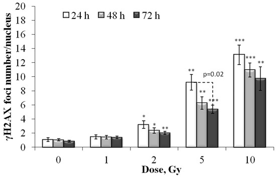 Dose-dependent changes in the number of residual γH2AX foci in the Ki-67 negative human fibroblasts 24 h, 48 h and 72 h after irradiation. Data are means ± SE of three independent experiments. * p < 0.05, ** p < 0.01 and *** p < 0.001—compared with the corresponding time of control.