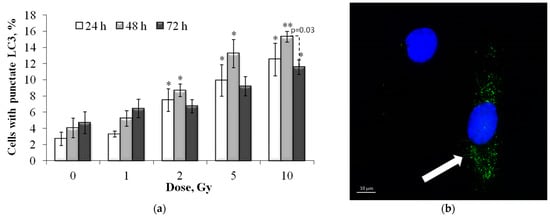 (a) Dose-dependent changes in the LC3-II positive cell fraction in human fibroblasts 24 h, 48 h and 72 h after irradiation. Data are means ± SE of three independent experiments. * p < 0.05 and ** p < 0.01—compared with the corresponding time of control; (b) Representative microphotograph of the immunocytochemically labeled cells with LC3-II (LC3-II positive cell with punctate LC3-II (green) is marked with the arrow). Nuclei are counterstained with DAPI (blue).