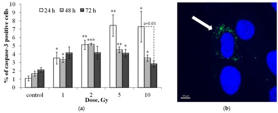 (a) Dose-dependent changes in the caspase-3 positive cell fraction in human fibroblasts 24 h, 48 h and 72 h after irradiation. Data are means ± SE of three independent experiments. * p < 0.05 and ** p < 0.01, *** p < 0.001—compared with the corresponding time of control; (b) Representative microphotograph of the immunocytochemically labeled cells with caspase-3 (caspase-3 positive cell with punctate caspase-3 (green) is marked with the arrow). Nuclei are counterstained with DAPI (blue).