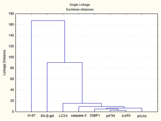 To understand the overall picture of the relationship between changes in the studied indicators, it seemed interesting to conduct a cluster analysis with the construction of a hierarchical cluster tree. It has been shown that the most similar are changes in the number of foci of DRR proteins with the following hierarchy in order of increasing linkage distance: (1) pATM and p-p53; (2) pATM, p-p53 and 53BP1; (3) pATM, p-p53, 53BP1 and γH2AX (Figure 11). The following branches were identified at the following levels: (4) foci of DDR and caspase-3 proteins; (5) DDR proteins, caspase 3 and LC3-II; (6) foci of DDR, caspase 3 and LC3-II proteins; (7) foci of DDR, caspase 3, LC3-II, and SA-β-gal proteins (Figure 11). The resulting cluster tree visually demonstrates the development of a cell response to irradiation 24–72 h after fibroblast irradiation at doses of 1–10 Gy: unrepaired and complex DNA damage induces DDR, which primarily induces cell death through the mechanisms of apoptosis and autophagy with a progressive switch to a senescent state.