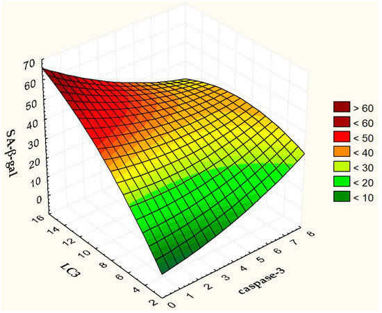 Figure 12 presents a 3D Surface Plot to show how the proportion of SA-β-gal+ cells varies with changes in the proportion of caspase-3 and LC3 positive cells. It is noteworthy that senescence and autophagy act as partners, reinforcing each other and acting in opposition to apoptosis (Figure 12).