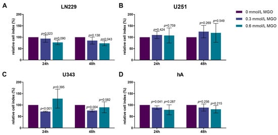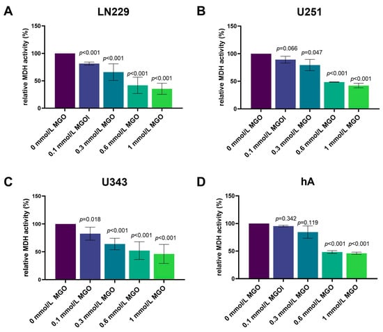 The influence of MGO on the cell vitality of LN229, U343, U251, and hA after 24, 48, 72, and 96 h was investigated using an XTT assay (Supplementary Materials Figure S1). MGO showed concentration-dependent cytotoxic effects in all cell lines after 24 h (Figure 1). In LN229, the cell vitality decreased in a concentration-dependent manner, with a reduction in the cell vitality of 18.53 ± 2.71%; p < 0.001with 0.1 mmol/L, 34.15 ± 15.07%; p < 0.001 with 0.3 mmol/L, 58.28 ± 14.90%; p < 0.001 with 0.6 mmol/L; and the strongest effect with 1 mmol/L with a reduction of 64.53 ± 10.11%; p < 0.001 (Figure 1A). Equivalent results were observed in the U251 and U343 cell lines (Figure 1B,C). The treatment with 0.1 mmol/L MGO did not affect the cell vitality of the U251 cells and 0.3 mmol/L MGO showed a 20.54 ± 10.21%; p = 0.047 reduction in the cell vitality. The 0.6 mmol/L MGO decreased the cell vitality by 51.13 ± 0.34%; p < 0.001 and 1 mmol/L by 57.69 ± 4.00%; p < 0.001 (Figure 1B). In the U343 cells, 0.1 mmol/L reduced the cell vitality by 17.43 ± 11.47%; p = 0.018, 0.3 mmol/L reduced it by 35.96 ± 10.36%; p < 0.001, and 0.6 mmol/L MGO reduced it by 47.86 ± 15.86%; p < 0.001. A 53.82 ± 17.02%; p < 0.001 reduction in the cell vitality was observed at 1 mmol/L MGO (Figure 1C). In the hA cell line, the cell vitality was not affected by treatment with 0.1 and 0.3 mmol/L MGO, but a 51.78 ± 2.53%; p < 0.001 reduction in the cell vitality was observed at concentrations of 0.6 mmol/L and a 53.97 ± 2.05%; p < 0.001 reduction was observed with 1 mmol/L MGO (Figure 1D). The IC50 of MGO treatment measured 0.384 ± 0.040 mmol/L in the LN229 and 0.4379 ± 0.037 mmol/L in the U251 cells. For the U343 cells, the IC50 was slightly lower at 0.368 ± 0.099 mmol/L and for the hA cells it was slightly lower at 0.333 ± 0.032 mmol/L MGO.