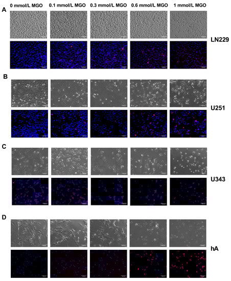 Microscope imaging of glioma cell lines and hA 24 h after MGO treatment. Bright field (above) and fluorescence (below) microscope imaging of LN229 (A), U251 (B), U343 (C), and hA (D) 24 h after MGO treatment. Cells were stained with DAPI (blue) and propidium iodide (red). Scale bar = 100 μm.