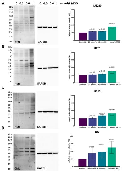 To evaluate the level of glycation with the increasing MGO concentration, immunoblotting was performed. The cells were treated with various concentrations of MGO (0.3, 0.6 and 1 mmol/L), and proteins were extracted and separated using SDS PAGE. Carboxymethyl Lysine antibody was used to verify glycation. An increase in glycation could be observed in all four cell lines in a concentration-dependent manner (Figure 3). In the LN229 cell line, protein glycation increased slightly after treatment with 0.3 and 0.6 mmol/L MGO and a 76.77 ± 24.75%; p = 0.011 increase was observed with 1 mmol/L (Figure 3A). Similar results were detected in the U251, where 1 mmol/l led to an increase in glycation of 53.09 ± 30.97%; p = 0.072 (Figure 3B). In the U343 cell line, 0.3 mmol/L MGO led to no increase in glycation but glycation increased with 0.6 mmol/L MGO by 34.06 ± 14.85%; p = 0.032 and with 1 mmol/L by 63.43 ± 33.89%; p = 0.057 (Figure 3C). The hA showed the strongest effect of glycation, with an increase of 72.30 ± 62.41%; p = 0.231 with 0.3 mmol/L MGO, 93.80 ± 77.57%; p < 0.001 with 0.6 mmol/L; and 152.21 ± 81.69%; p = 0.223 with 1 mmol/L (Figure 3D). Interestingly, a distinct pattern of glycated proteins was observed in the cell lines.