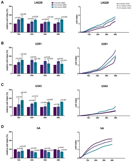 Invasion of glioma cell lines and hA after MGO treatment. LN229 (A), U251 (B), U343 (C), and hA (D) were cultivated in absence or presence of MGO (0.3 mmol/L or 0.6 mmol/L) on CIM-plates, coated with Geltrex to imitate basement membranes. Invasion was measured every 15 min for 48 h. Graphs (left column) show cell indices normalized to the untreated cells and graphs (right column) show measured cell indices for 12, 24, 36, and 48 h. Student’s t-test was performed for statistical analysis. Graphs represent the means and SDs of three independent biological replicates.