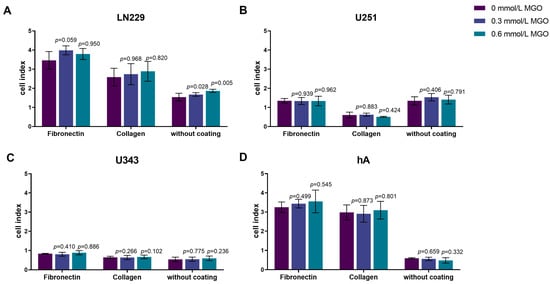 Adhesion of glioma cell lines and hA after MGO treatment. LN229 (A), U251 (B), U343 (C), and hA (D) were seeded at concentrations of 0.3 mmol/L and 0.6 mmol/L MGO on plates either coated with fibronectin, collagen, or left uncoated. Graphs display measured cell index after 4 h. Absolute cell index was used to show the different adherence to the different matrices and to illustrate the differences between the cells. Student’s t-test was performed for statistical analysis. Graphs represent the means and SDs of three independent biological replicates.