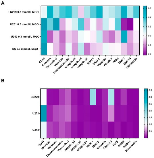 The effect of glycation on the ECM components varied among the cell lines, with an overall upregulation in the LN229 cells. The strongest effect of glycation was observed on the expression of CD44, which was upregulated in the U251 (1.655 ± 0.259, p = 0.023), U343 (1.548 ± 0.562, p = 0.240), and hA (1.641 ± 0.657, p = 0.058) cells, but remained unchanged in the LN229 cells (1.055 ± 0.145, p = 0.539). Brevican expression was upregulated in the LN229 (1.498 ± 0.369, p = 0.057) and U251 cells (1.303 ± 0.074, p = 0.004) and downregulated in the U343 cells (0.725 ± 0.302, p = 0.166). Similar results were observed with tenascin C, as the expression increased in the LN229 (1.203 ± 0.140, p = 0.046) and U251 cells (1.655 ± 0.238, p = 0.018). In the LN229 cells, versican and thrombospondin were upregulated (1.358 ± 0.174, p = 0.012; 1.392 ± 0.151, p = 0.021), as well as SNAI1 and SNAI2 (1.335 ± 0.160, p = 0.011; 1.491 ± 0.294, p = 0.027). The TGF-β expression increased in the LN229 and U251 cells (1.229 ± 0.099, p = 0.007; 1.328 ± 0.596, p = 0.281). The MMP2 expression decreased after glycation in the U251 cells (0.625 ± 0.094, p < 0.001). On the contrary, the MMP2 expression increased in the LN229 and U343 cells after glycation (1.518 ± 0.294, p = 0.022; 1.544 ± 0.466, p = 0.089). No expression of MMP9 was detected in any of the analyzed cells. The remaining components were not differentially expressed by glycation.